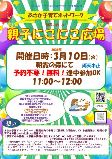 少しずつ春の気配を感じる朝霞の森で親子で、ほっと笑顔になれる時間を過ごしませんか。 3月の親にこは、 ★朝霞の森でのプレーパーク体験 ✂作って遊べる工作 親子にこにこ広場は、お子さんと一緒に「楽しい」「安心」「つながり」 を感じられる、あたたかな […]